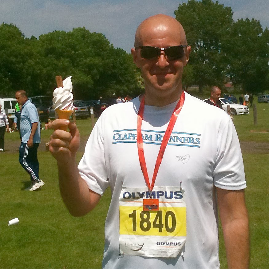 The course is very flat and very boring (up and down, up and down) but it’s well managed, with friendly marshals, plenty of water and sponges (ah! the sponges!) as well as the lure of a fine Rossi ’99 ice cream at the finish. Lots of club running vests, but also plenty of locals running for the Havens Hospices, who organise the event.