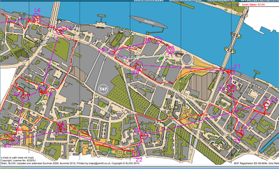 Above is an extract from the Mens Open class – billed as 8.2km. My route (shown by the red squiggly line) was 8.2miles! I made the wrong route choice a few times but that’s not surprising given the number of twists and turns you have to take to find the best route – up, down, over or through the city.