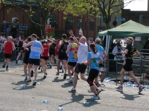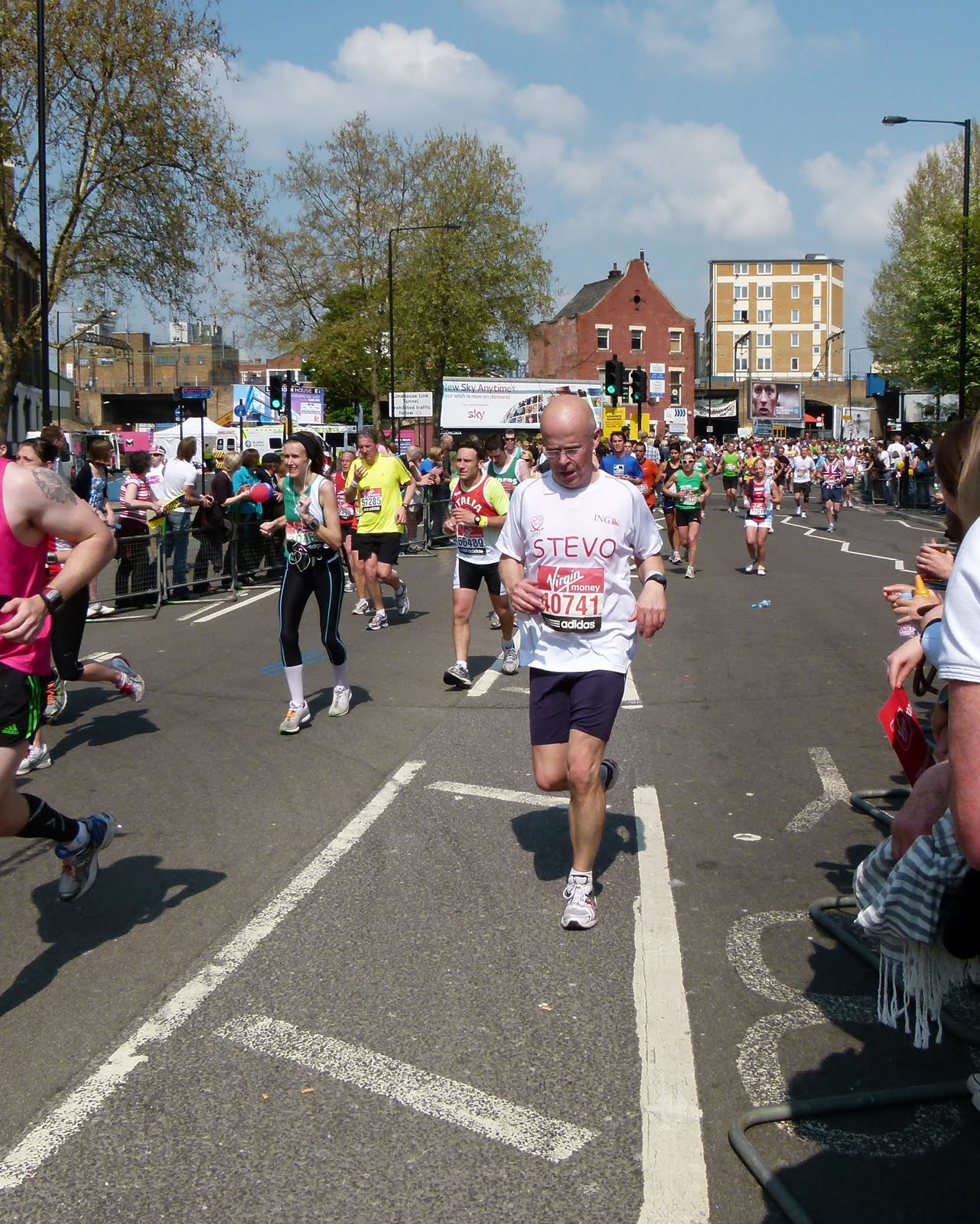 A brief reflection on my VLM 2011 experience. Under cloudy skies it started broadly to plan and I was going pretty well, taking in the atmosphere from the phenomenal crowds and encouraged by frequent chants of StevOOOO!! At c.8.5 miles Anthony did very well to recognise my apparently familiar “chuff-chuff” before he saw me alongside! – a fumbled handshake and on we separately went …
