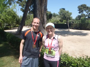 The first half I was on fire, running just ahead of the 3:45 pace maker and bopping along to my special marathon soundtrack of ”eye of the tiger”, a crazy spanish man made ”slow down” gestures at me and indicated that a hill was coming up – pffft, what did he know? Turns out, he knew a lot more than I thought I did! I took the first few hills in my stride, but around the 30k mark and two packets of jelly beans later, it was getting tough! The heat of the day was setting in (25 deg) and I was beginning to appreciate my beginners spanish lessons! Venga! Venga! Chica! (Go go girl!) and Muy bien (very good) were very welcome cheers….some were telling me to ”vamoos!” – which I hope they meant in a nice way! I felt myself dropping back but kept the arms pumping and the legs trying to follow suit! Paramedics on rollerblades skated through the runners, giving us much needed ice sprays & dollops of vaseline – brilliant idea!