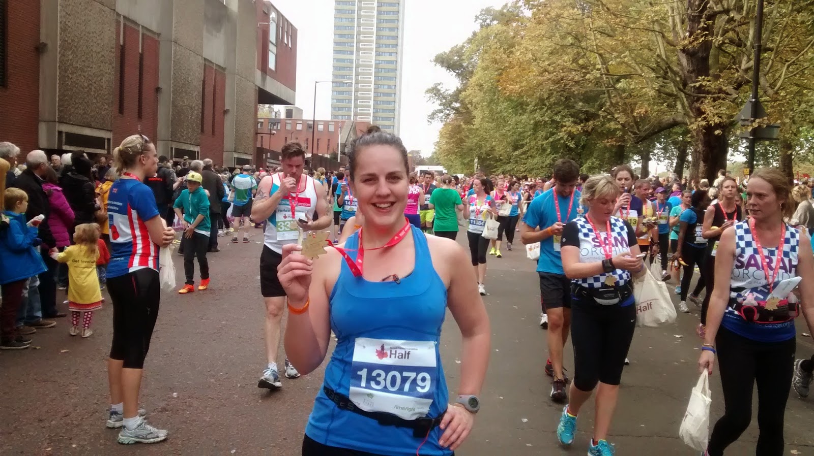 The race was brilliantly organised – efficient bag drop, ample portaloos (very important), the course stayed wide for the mostpart (although there was some runner congestion – it could be difficult to hit a PB), and the entire route was free from leaves – a remarkable feat! It all made such a difference. The race day festival was well thought through, from the food stalls and Pimms tent, the live choir, the screens dotted around showing runners crossing the finish line, the climbing wall, giant games, as well as the obligatory mass warm up and stretching classes. I’d gone on my own so didn’t hang around, but there was plenty there to keep you busy.